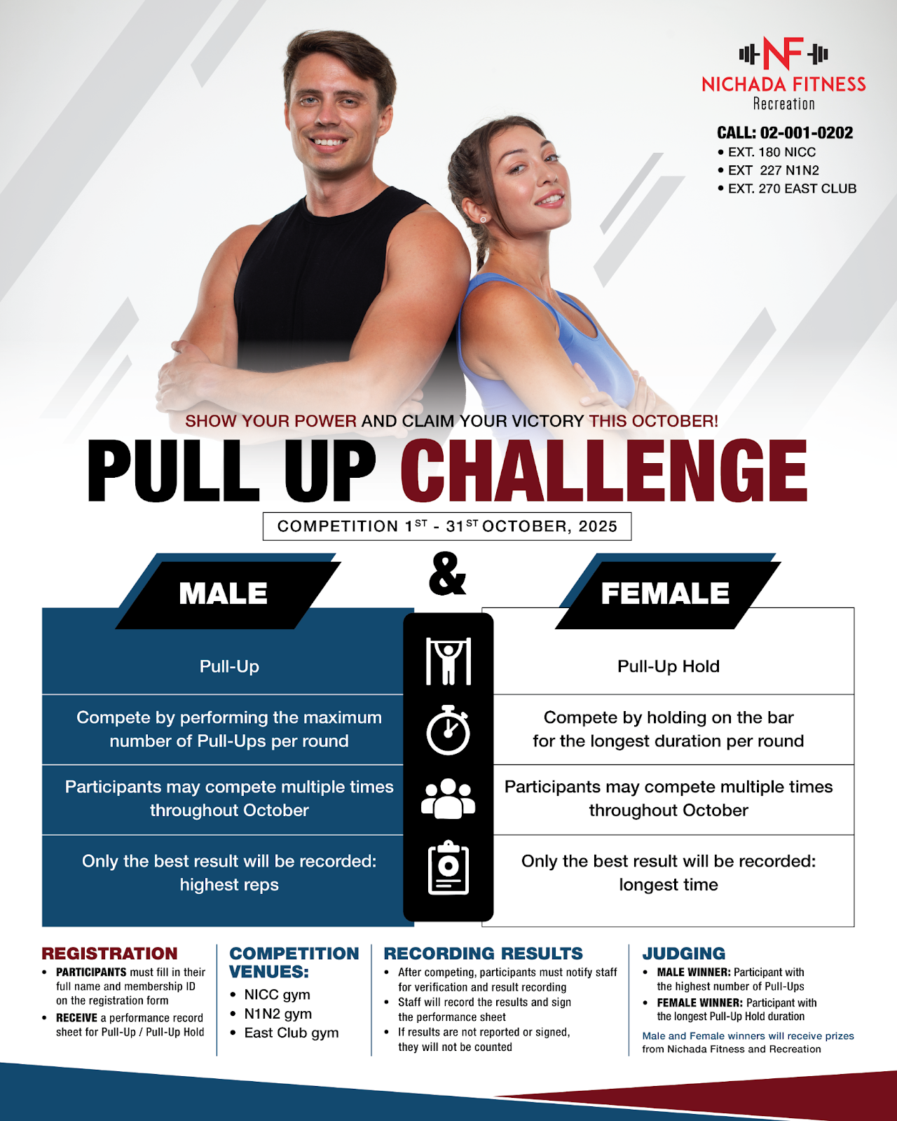 The male and female winners will receive awesome prizes from Nichada Fitness and Recreation, and of course, the ultimate bragging rights as our 2025 Pull-Up Challenge Champions!